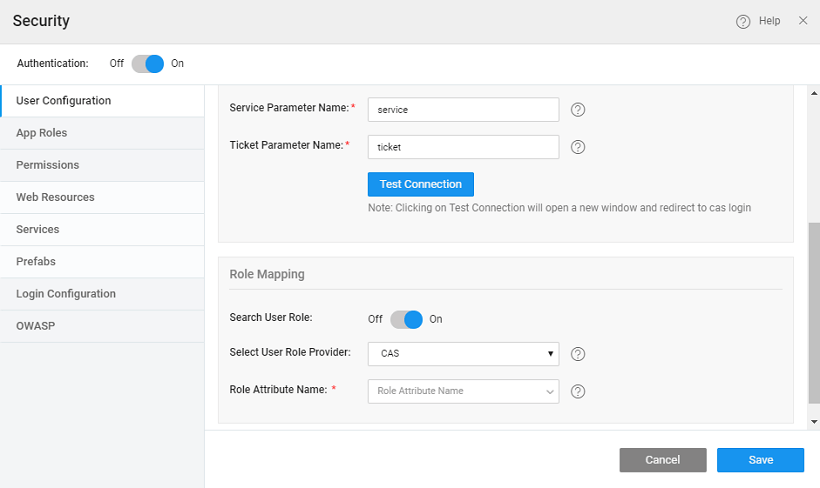 - The user can configure CAS role attribute and the same role can be configured in the WaveMaker application. The Role Attribute Name needs to be configured.