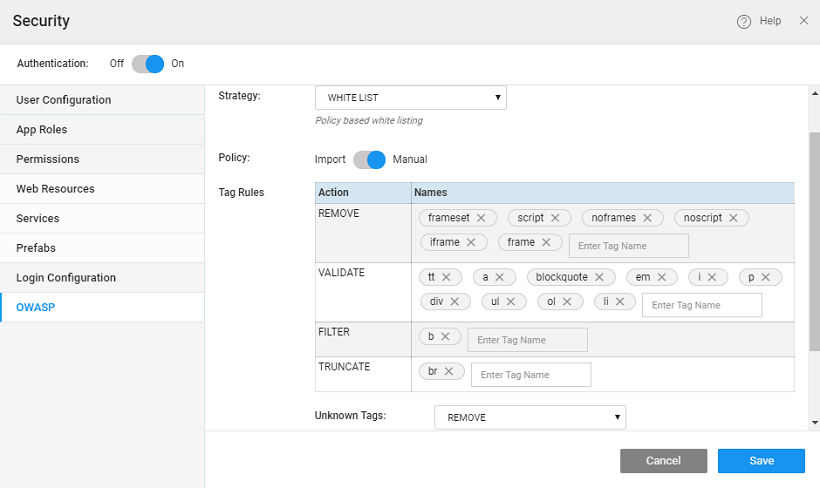 • Manual tags: Custom tag rules can be specified in terms of HTML tags which are categorized based on their actions. The possible actions are Validate, Remove, Truncate and Filter. These rules are used while handling the tags in the XSS attacks. You can add or delete tags against an action. We can specify the action for all Unknown tags also.