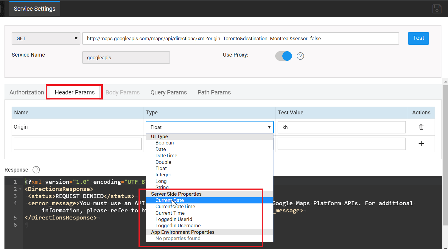 When working with REST Services, it is essential to protect your API keys and passwords and ensure your app sensitive information hides from the UI and network calls. You can do this by using proxy server when configuring REST Services. For this, you should use App Environment Properties or Server Side Properties for Header and Query params.