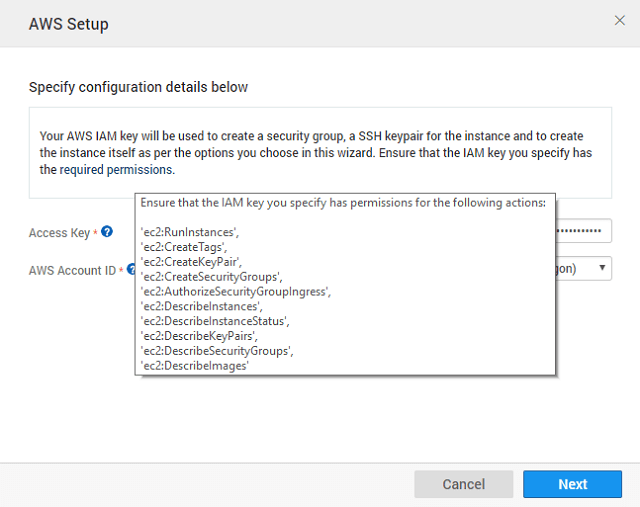 - While setting up the AWS account care should be taken to ensure that the IAM key has the permissions as listed in the configuration dialog.