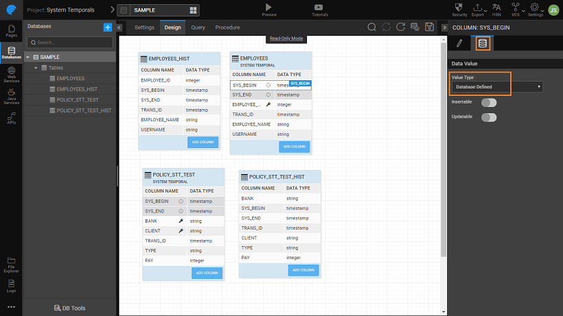 - By default system period columns and transaction id are marked as Database defined. The values need not be entered by the user, they will be auto-populated by the database.