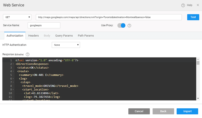 Web Servicesection and the Service Settings are displayed. - You can make changes to the service settings. Once you make the changes, Test the changes before saving them. This is particularly helpful when the REST service has undergone any changes or when it needs additional input parameters. You can see the Response Format from the REST service in the JSON format as required by the platform.