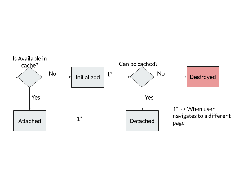 • As Cache is disabled on Page2, Page2 instances are destroyed when the user navigates from the Page2 (see steps 3, 5).