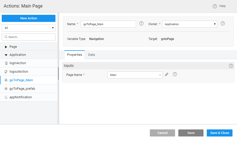 Navigation in the application happens using a Navigation Action. Whenever a page is created a corresponding gotoPage navigation action is generated or one can create the action manually.