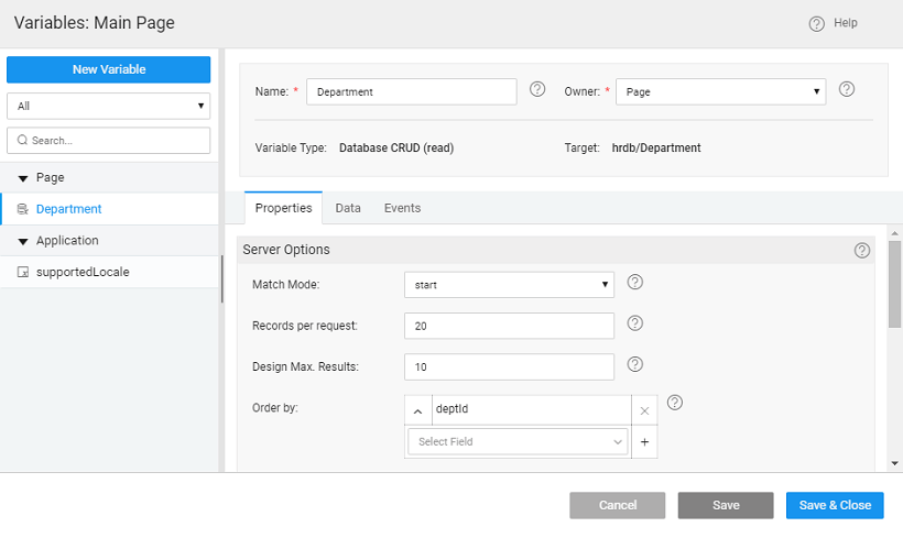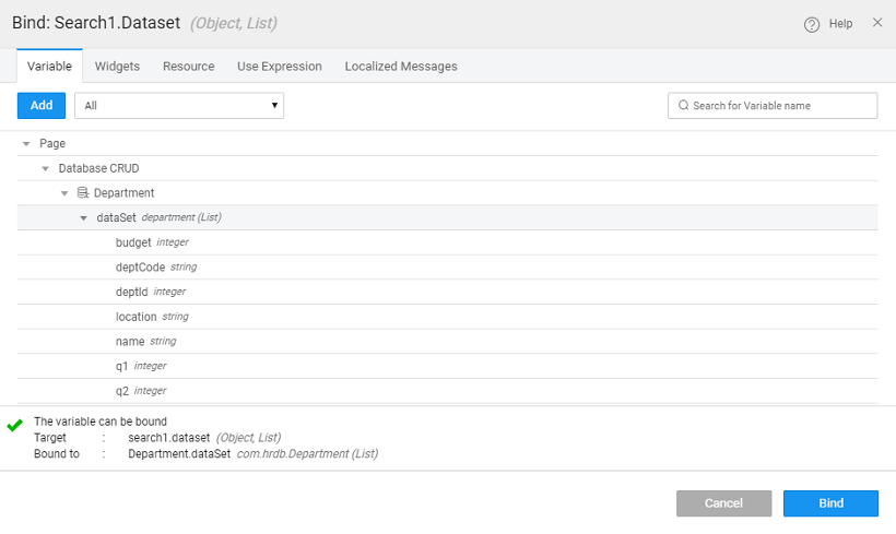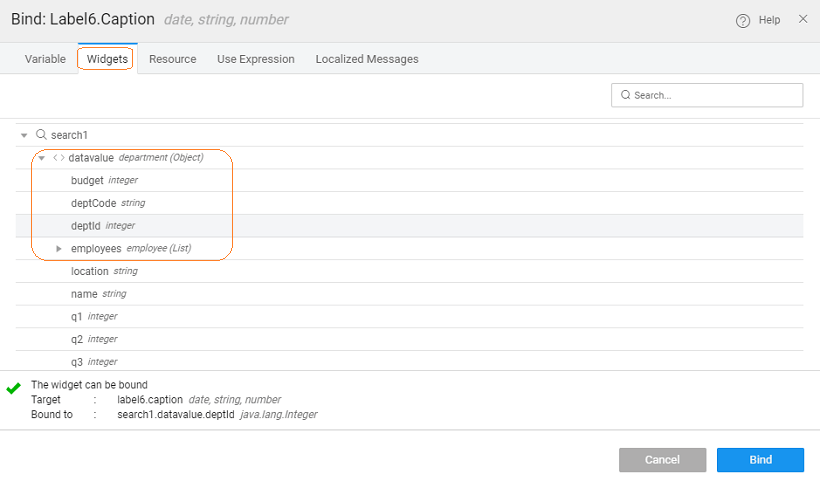 - Bind the Value dataset property of the search widget to the department variable created in the previuos step.