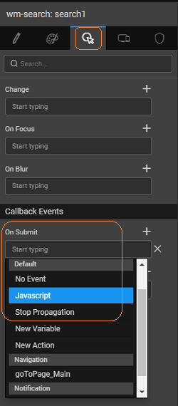 In the Script the following function will be created The selected item can be accessed by '$event.data.item' property as follows: Here we have set the labels to the department name and id returned by the search widget. NOTE: The label names might vary in your project.Page.search1Submit = function($event, widget) { Page.Widgets.label3.caption = $event.data.item.deptid; Page.Widgets.label4.caption = $event.data.item.name; };