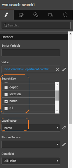- Set the Search key and Label Value properties to the column name you want to search by, in this case, name. Note: The Search Key, Label Value, and Image Source are bindable. For example, the Label Value can be bound in this case to 'deptcode+name', using the expression option from the binding dialog.