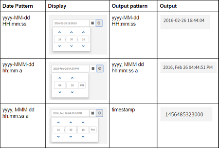 | Output Format | Defines the format of output datavalue returned by the date time widget. Default output format is 'timestamp', which returns the equivalent timestamp integer. E.g timestamp value for '2012-12-12 12:12 PM' is '1355294520000'. If the output format is given as 'yyyy-MM-dd hh:mm a', widget returns datavalue as '2012-12-12 12:12 PM'. |