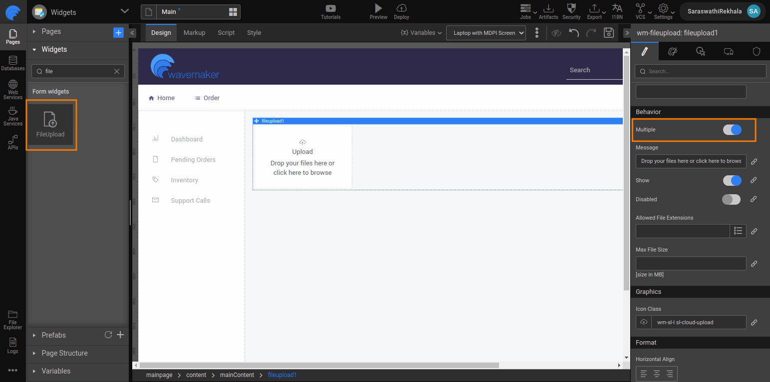 3. From the Properties panel, set the Multiple property to true, this will enable us to upload multiple files, else you can upload a single file at a time. fu_props