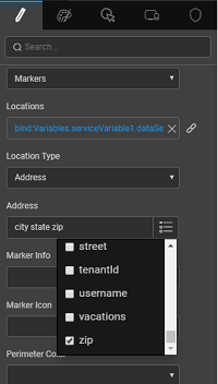 - Address wherein the Address fields in the form of a city, state, zip etc can be picked from the multi-list dropdown. These are the fields from the variable bound to the Locations property above.