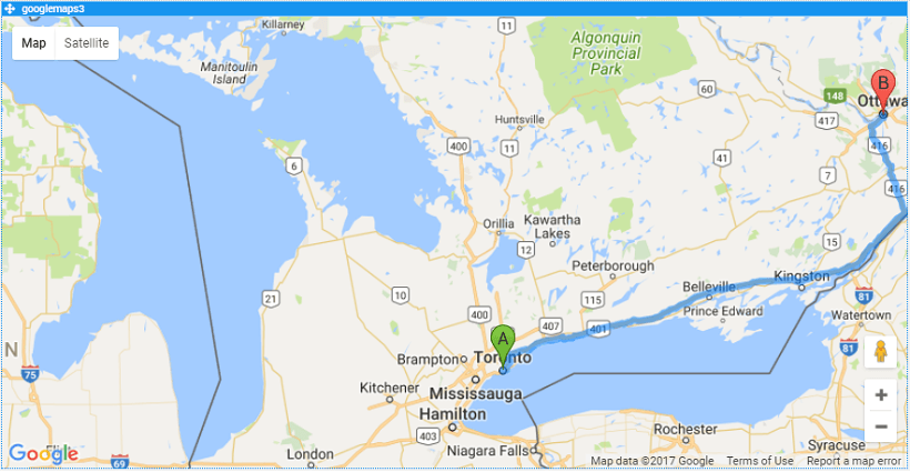 The Googlemaps prefab connects with Google Maps and displays the map on your page. It can be used either for location map or as route map or as a heat map.