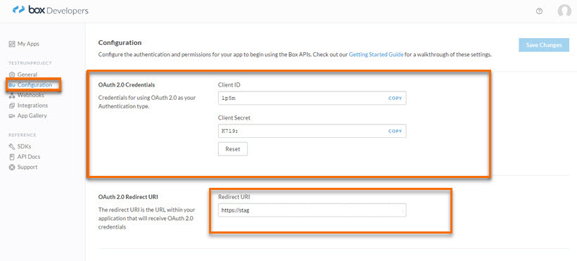 - Paste the selected callback URL in the redirect URI section of the App in Box, as highlighted in the below figure.