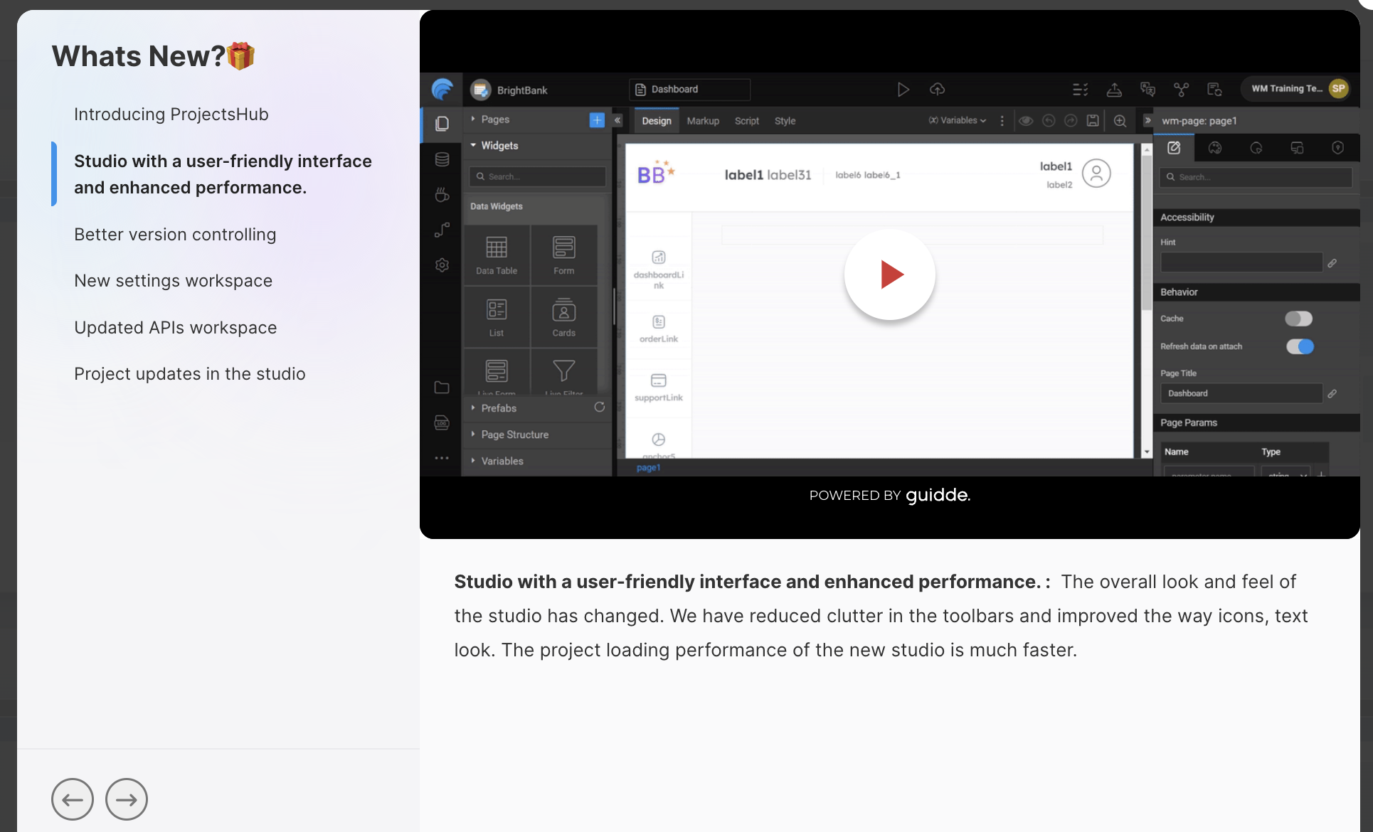 • Auto-Open on Login: If there are any unread notifications, the “What’s New” section will automatically open when you log in to WaveMaker Studio, ensuring you’re up-to-date from the start.