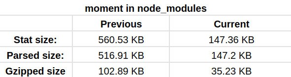 The Moment module size was reduced by 65.7% (from 102 KB to 35KB, Gzipped) compared to the original build.