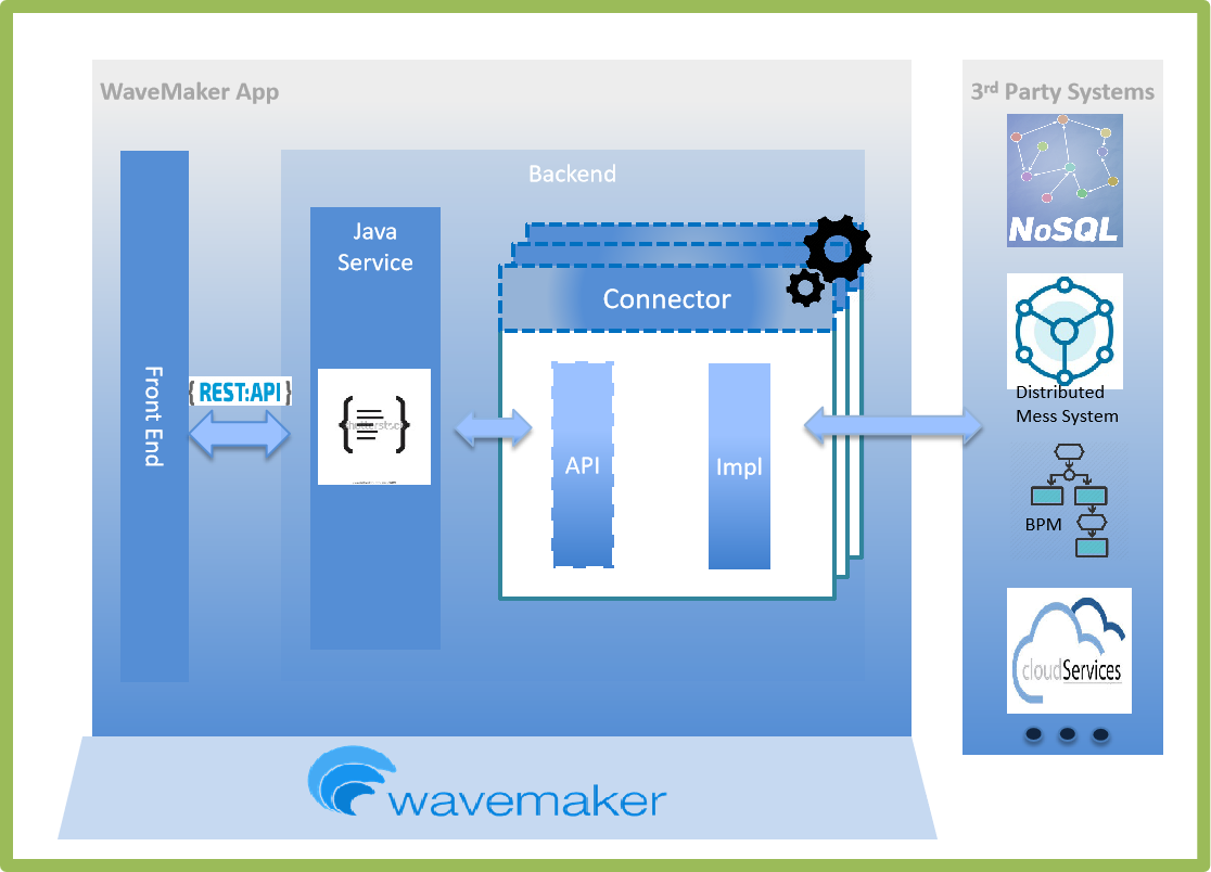 One or more Connectors can be used inside a WaveMaker Application. Connectors are orchestrated through Java Services.