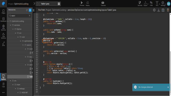 Please note the @Version annotation added in the above step might get reverted each time a DB re-import operation is performed, hence replace the @Version after each DB re-import.