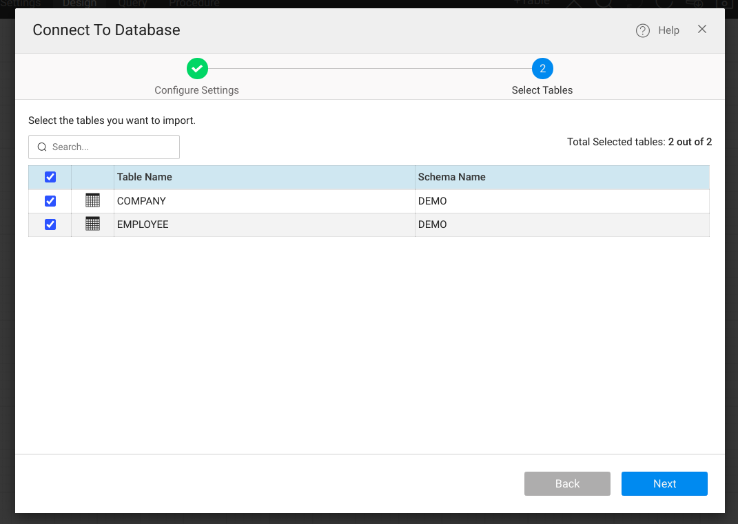 Select the desired tables to be imported and click on the Next button. This will now automatically generate the CRUD APIs for the select entities. The imported tables can be viewed from the DB designer.
