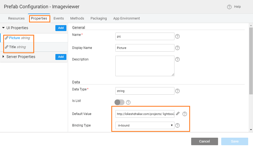• Properties: any properties you want to expose to the user of this prefab. Here we have set two properties pic and title, both being in-bound.