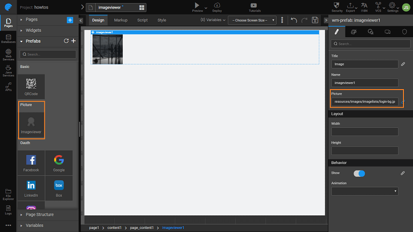 4. Open/Create a project to see the usage of the above Prefab. Import the Prefanb from Artifacts listing dialog. Drag and drop the Imageviewer onto the canvas.