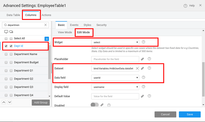 3. Drag and drop Data Table (editable) using a table, say, Employee, as the data source.