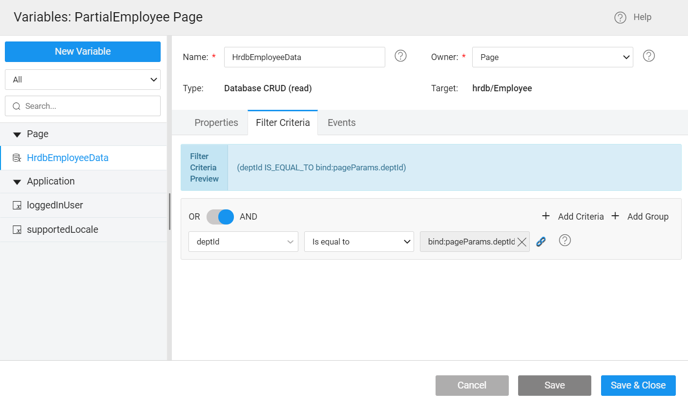 • Go to the Variable dialog. For the Employee variable under FilterCriteria, bind the deptId to the pageParams.deptId.