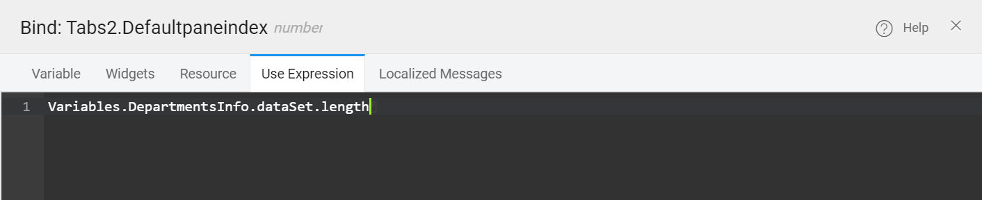 • From the Behavior section of the properties, bind the Default Pane Index property to Variables.DepartmentsInfo.dataSet.length using the Use Expression tab.