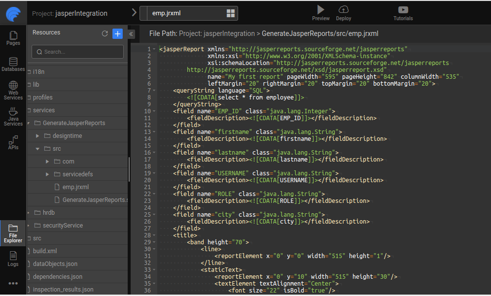 ${ServiceName}/src/folderThe following sample report jrxml is provided for your reference which loads the data from hrdb Employee table and generates the report.