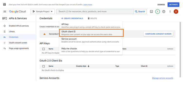 - Set up user account in the Google Console. This is to create an OAuth application to fetch the Client ID and Client Secret.