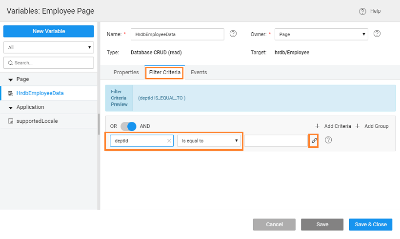 - Filter Employees: Next, we need to set the filter on List to display employee details for the department passed to this page. Select the List and locate the Value property under Dataset, click it to open the Employee Variable dialog. (You can also access the Variable from the Variables dialog). Under Filter Criteria tab add deptid, set the condition to Is equal to and click the bind icon for the value