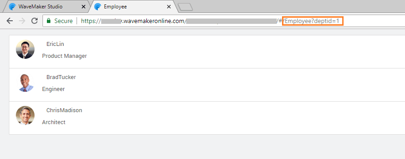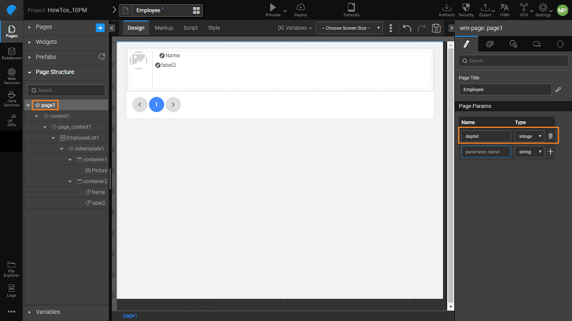 - Since Employee details have to be filtered based upon the selected Department, create a page parameter for the Employee page. Use this parameter to filter the list items.
