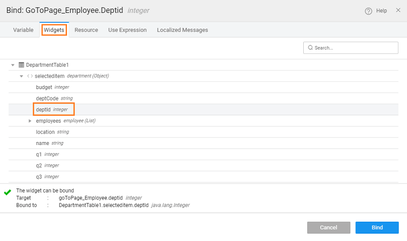 - Pass Parameter: Now we need to pass the selected row deptid to the Employee page. Select the goToPage_Employee from the Actions dialog and select the Data tab. Click the bind icon next to the deptid