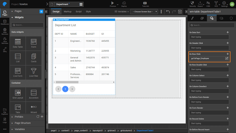 - Page Navigation: From the Events tab, set the On Row Click event to goToPage_Employee.
