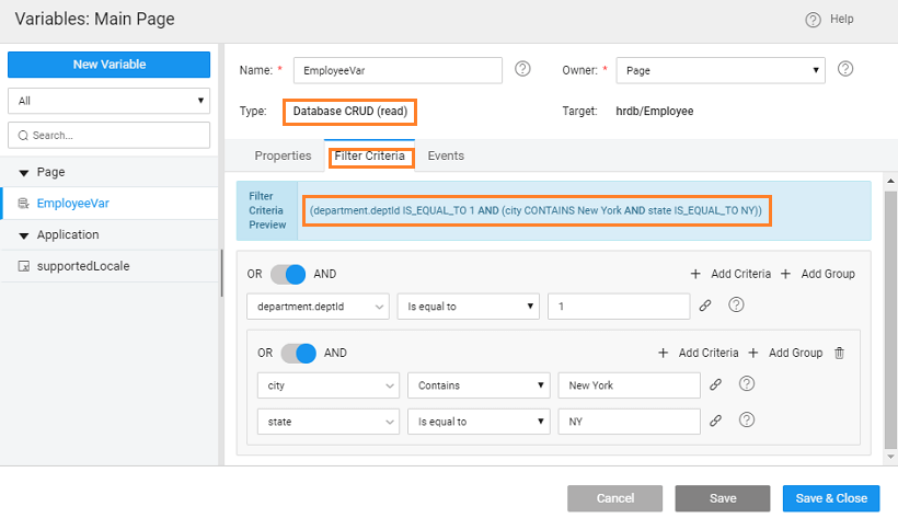 Scenario: To filter the rows fetched from a database table using the Filter Criteria option of Database CRUD Variable (of 'read' type). Features