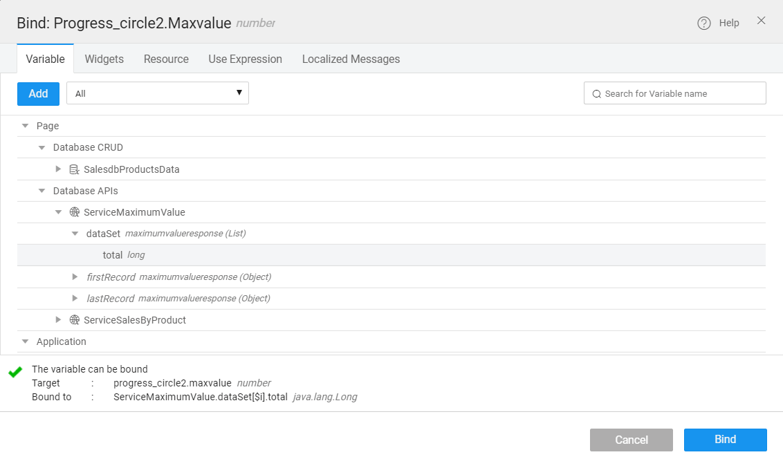 • Set the Maximum Value; for example, enter any number for a static value. For dynamic update, bind the Maximum value with the variable called ServiceMaximumValue.dataSet[$i].total.