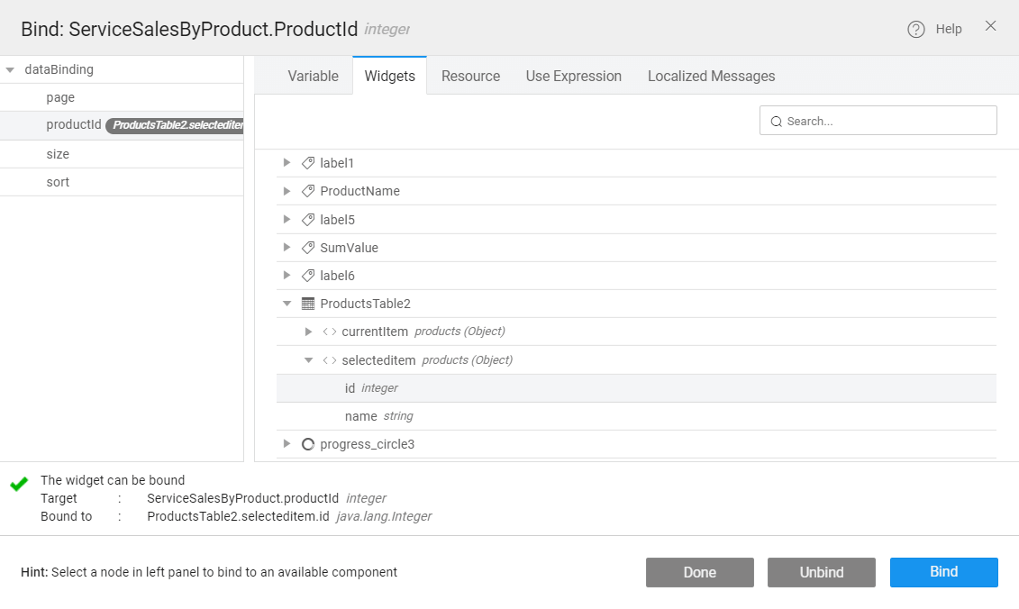 10. Go to the widgets tab, select ProductsTable2 → selecteditem → id.
