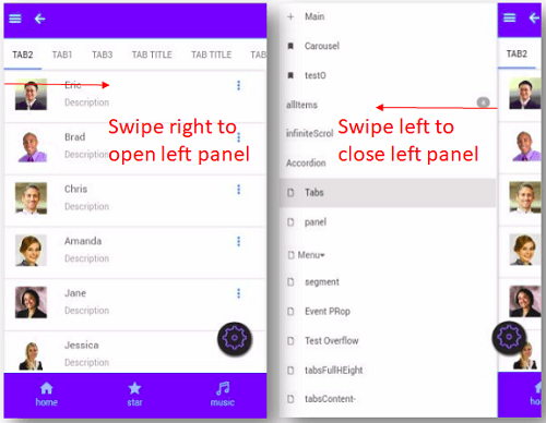 • Currently, the swipe gesture is supported by Left Panel, Tabs, and Carousel (Static) widgets.
