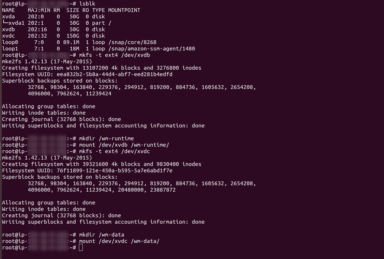 mkdircommand to create a mount point directory for the volume. The mount point is where the volume is located in the file system tree and where you read and write files after you mount the volume. For WME-Setup, create two directories using the following commands.