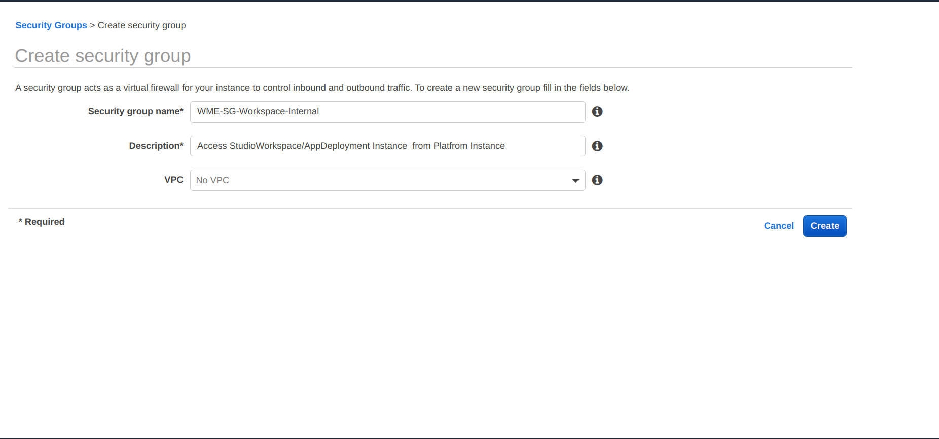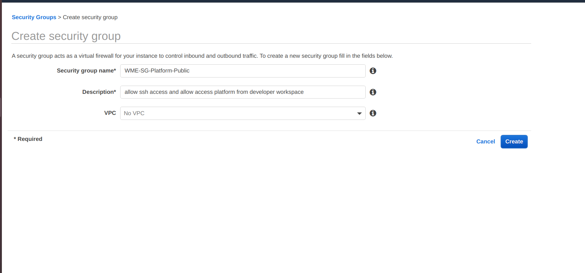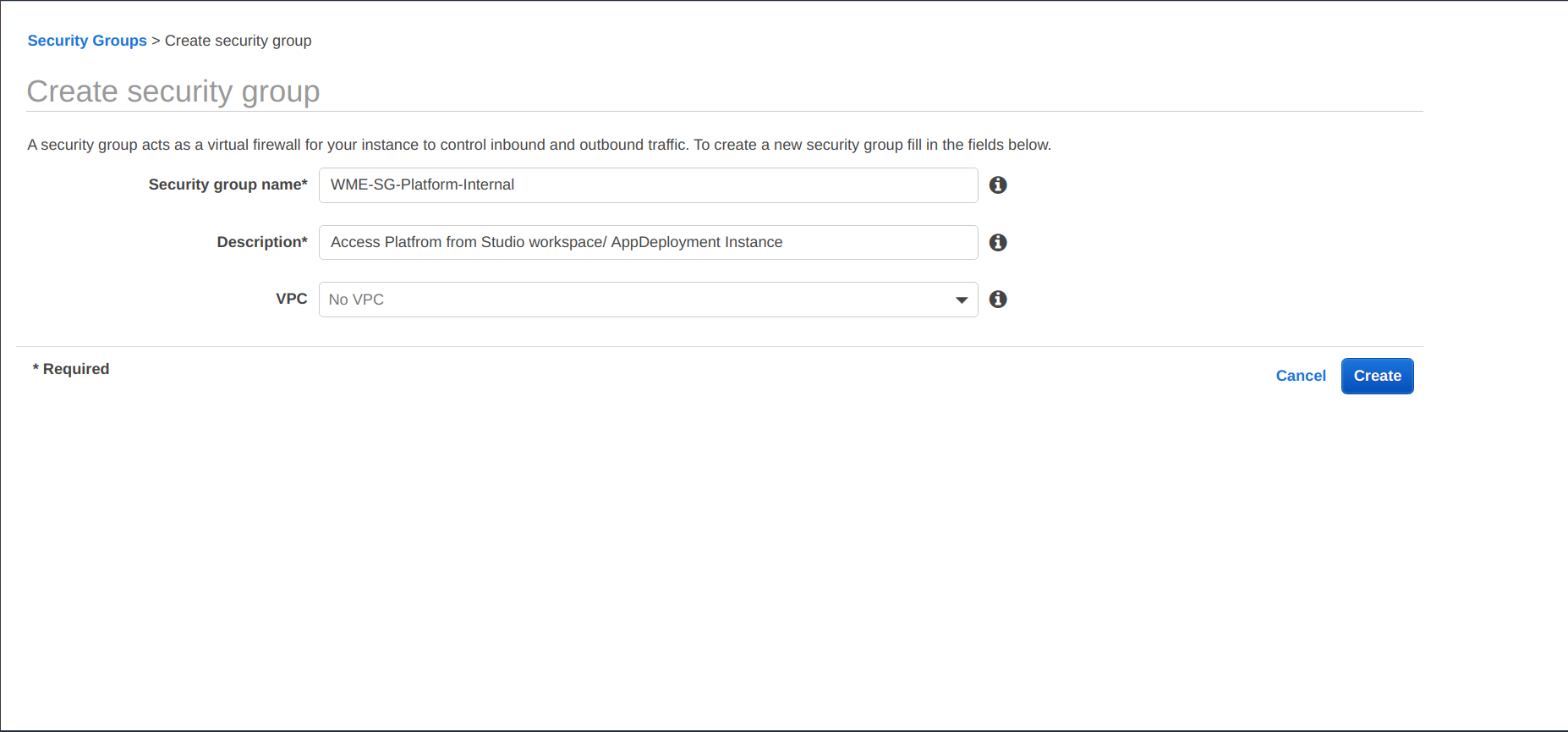- For creating security group, you need VPC. If you don't have a VPC and want to create one, to learn more about it, see AWS documentation for creating VPC.