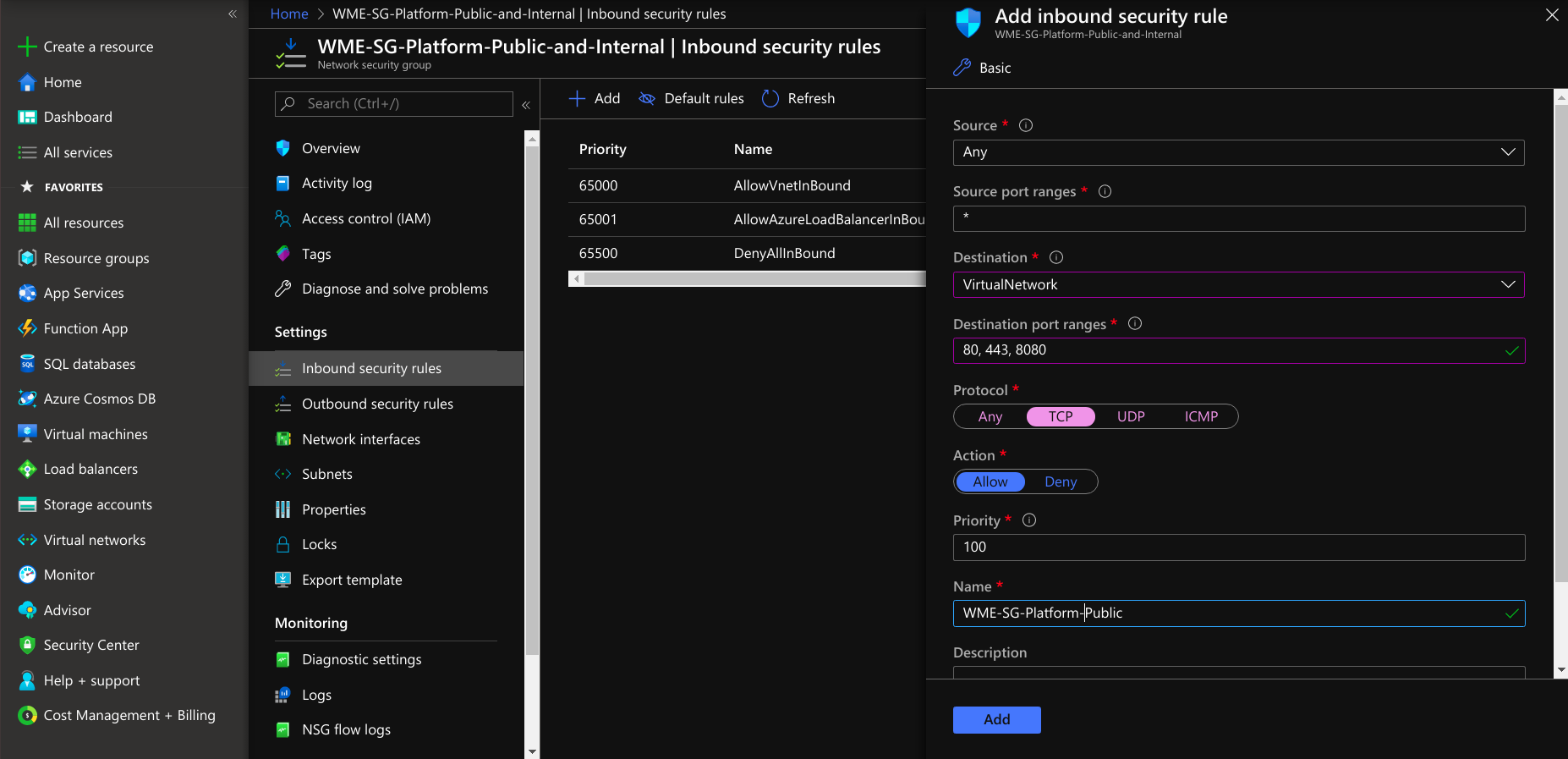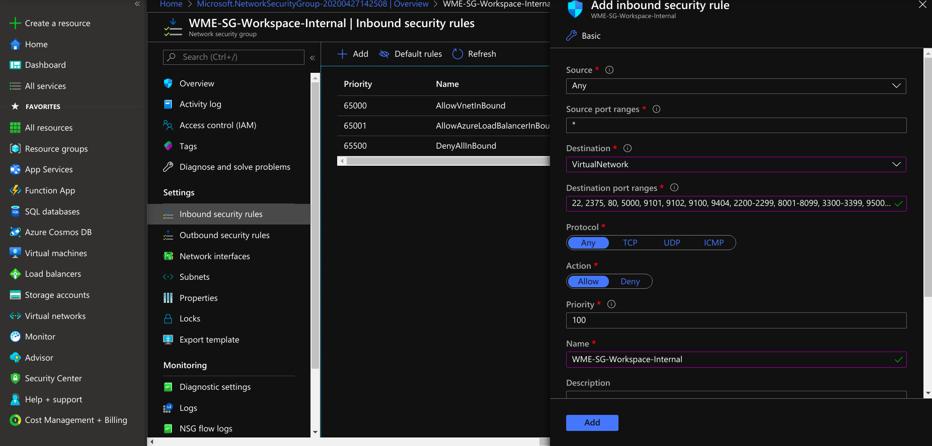 • Next, select protocol as TCP and select action allow. Provide priority is after the public access ports and select save and add the rule to the network security group.