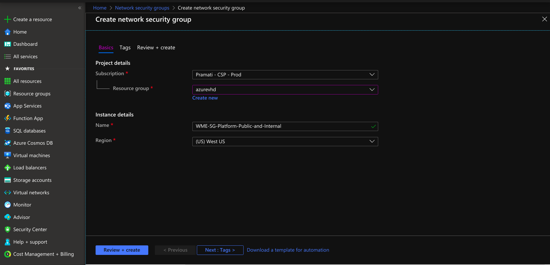 Creating network security group for platform virtual machine