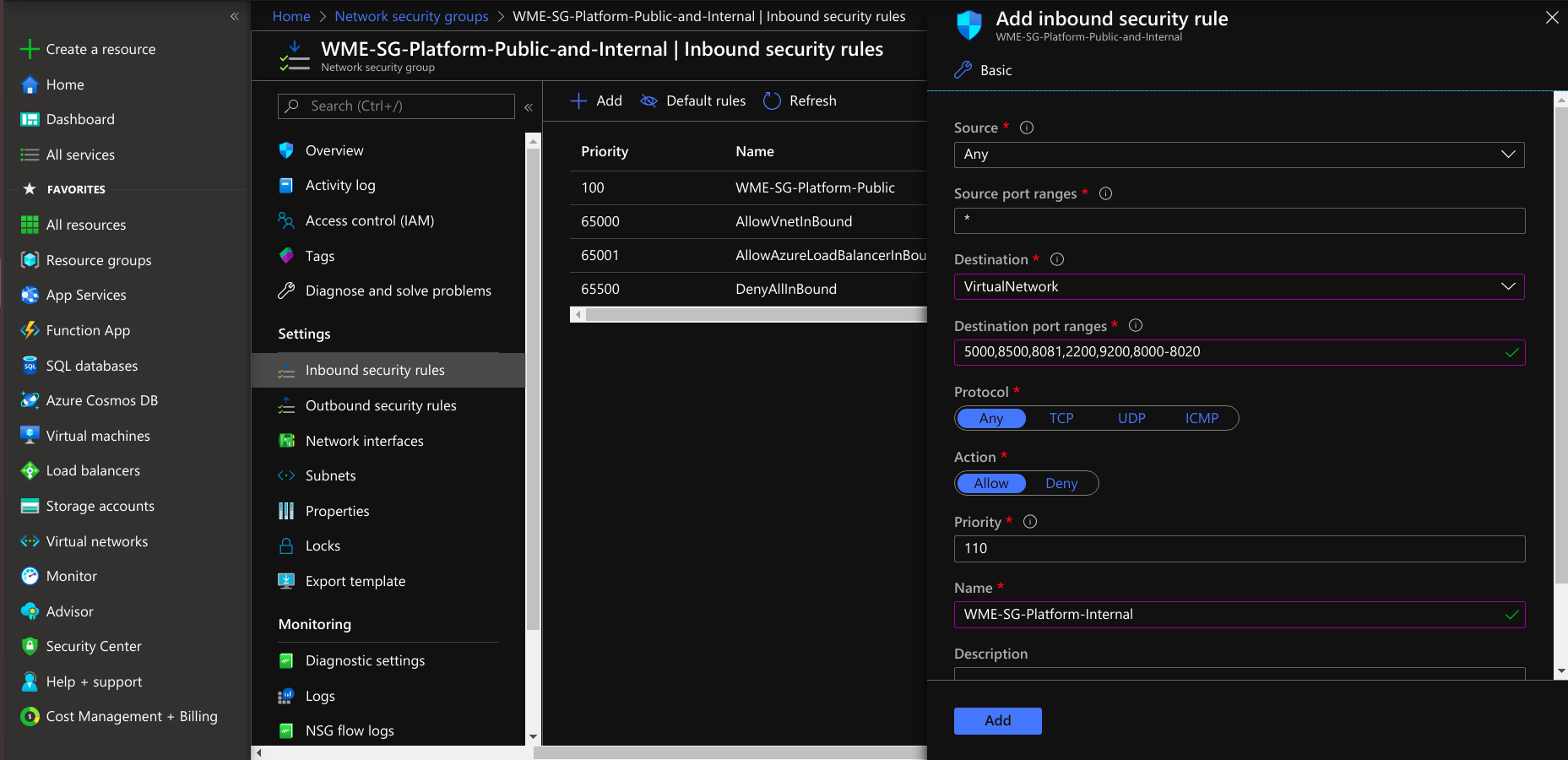 • After creating the network security group under settings, select inbound security rules, create a rule for developer network access and select protocol TCP and add a rule to a network security group.