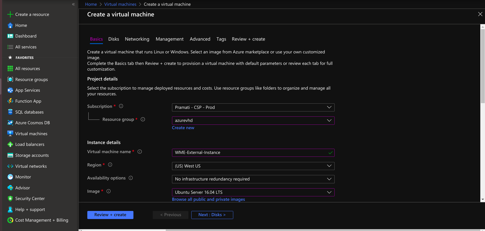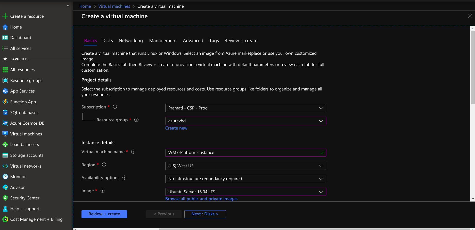 • Select the Ubuntu 16.04 image, 4 vCPU, 16 GiB (gigabyte) memory for the WME platform virtual machine, and select the same resource group and region of the virtual network and network security group.