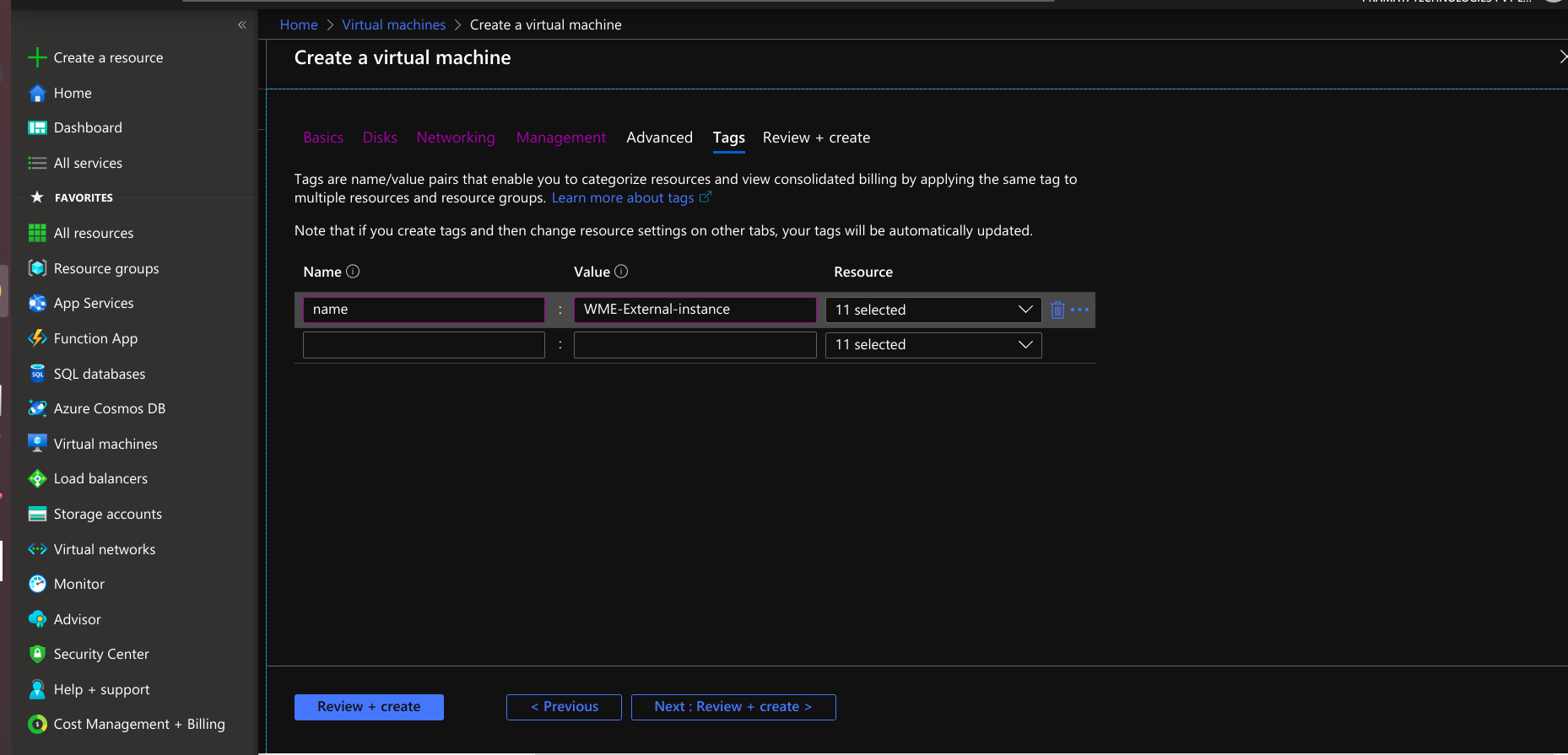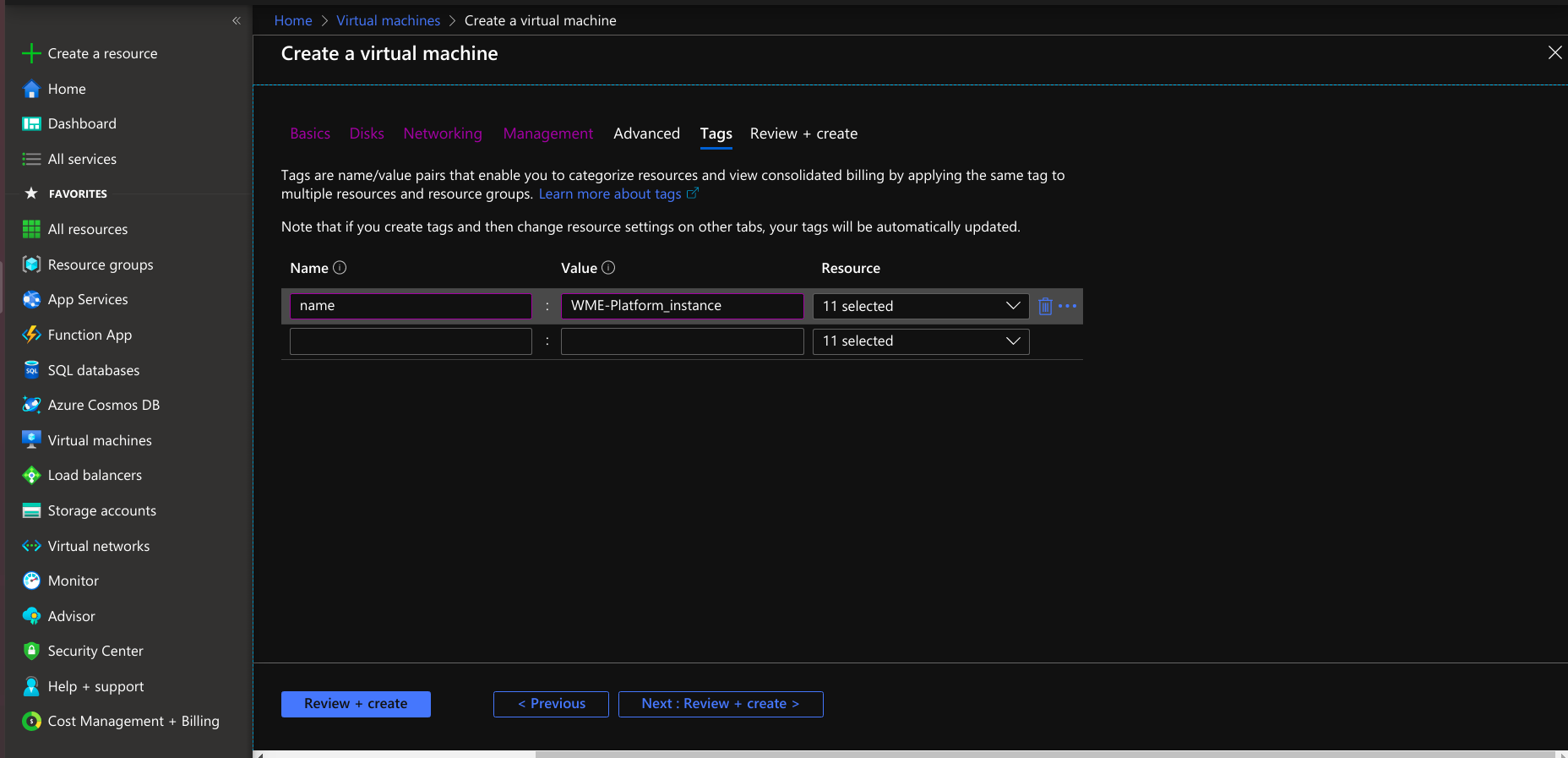 • Provide tags that are name-value pairs for the virtual machine for categorizing the resources.