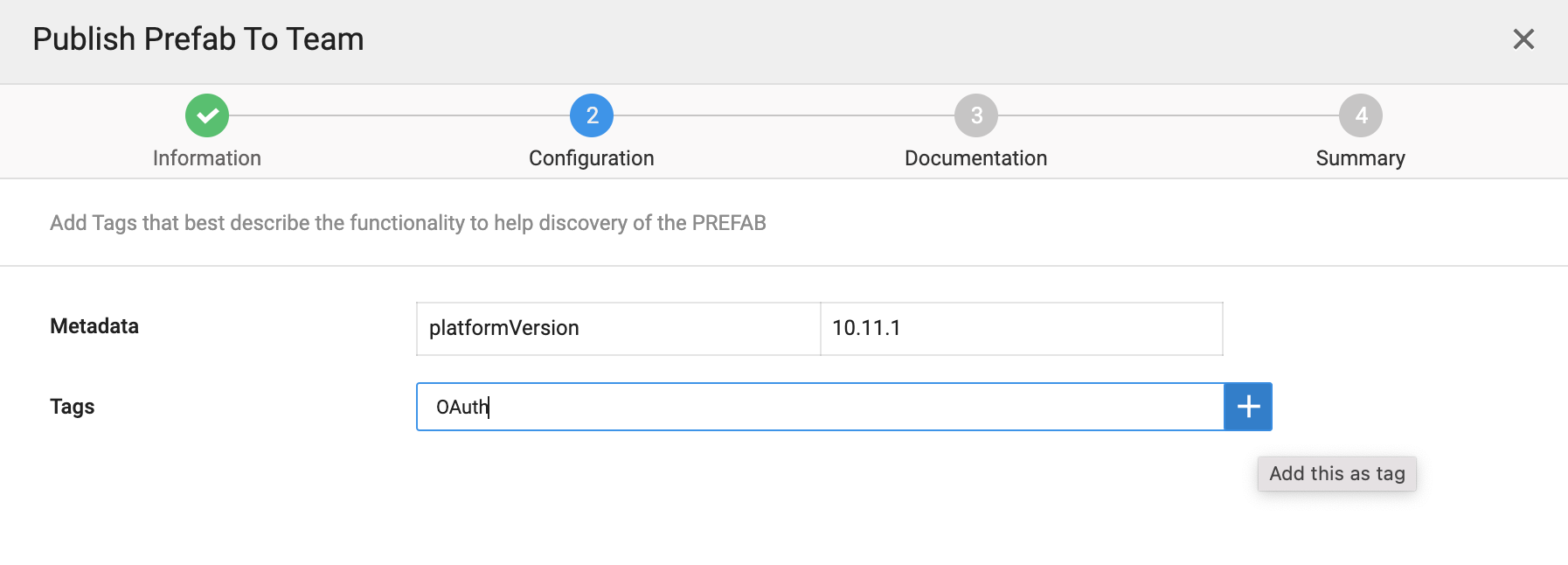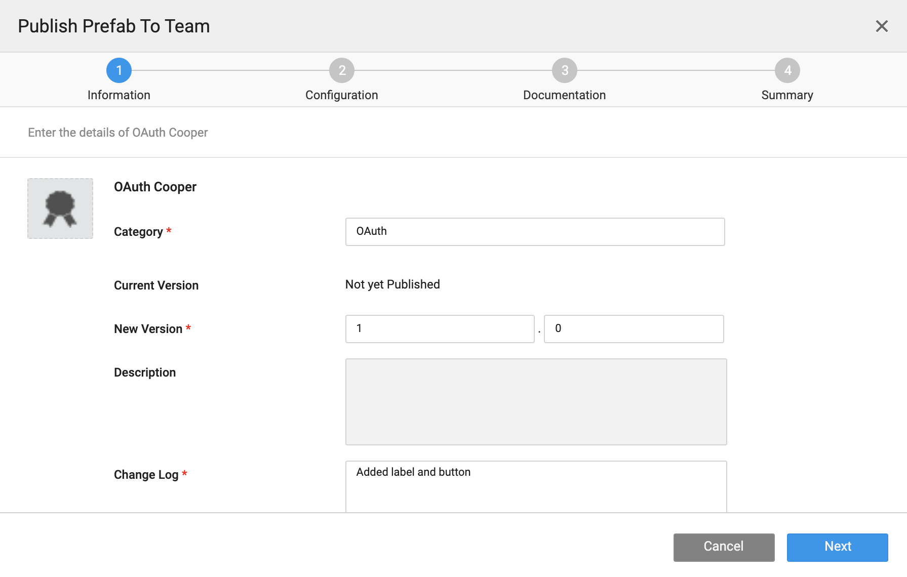 Verify the details in the configuration summary of the Prefab and click Publish. The published Prefab will be queued for approval by administrator.
