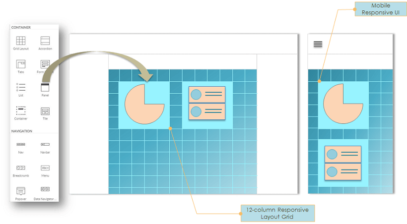 Pages are constructed as a composition of widgets using the visual drag-n-drop approach. Responsive Layout grid is used for the placement of widgets for automatically making them responsive to all devices.