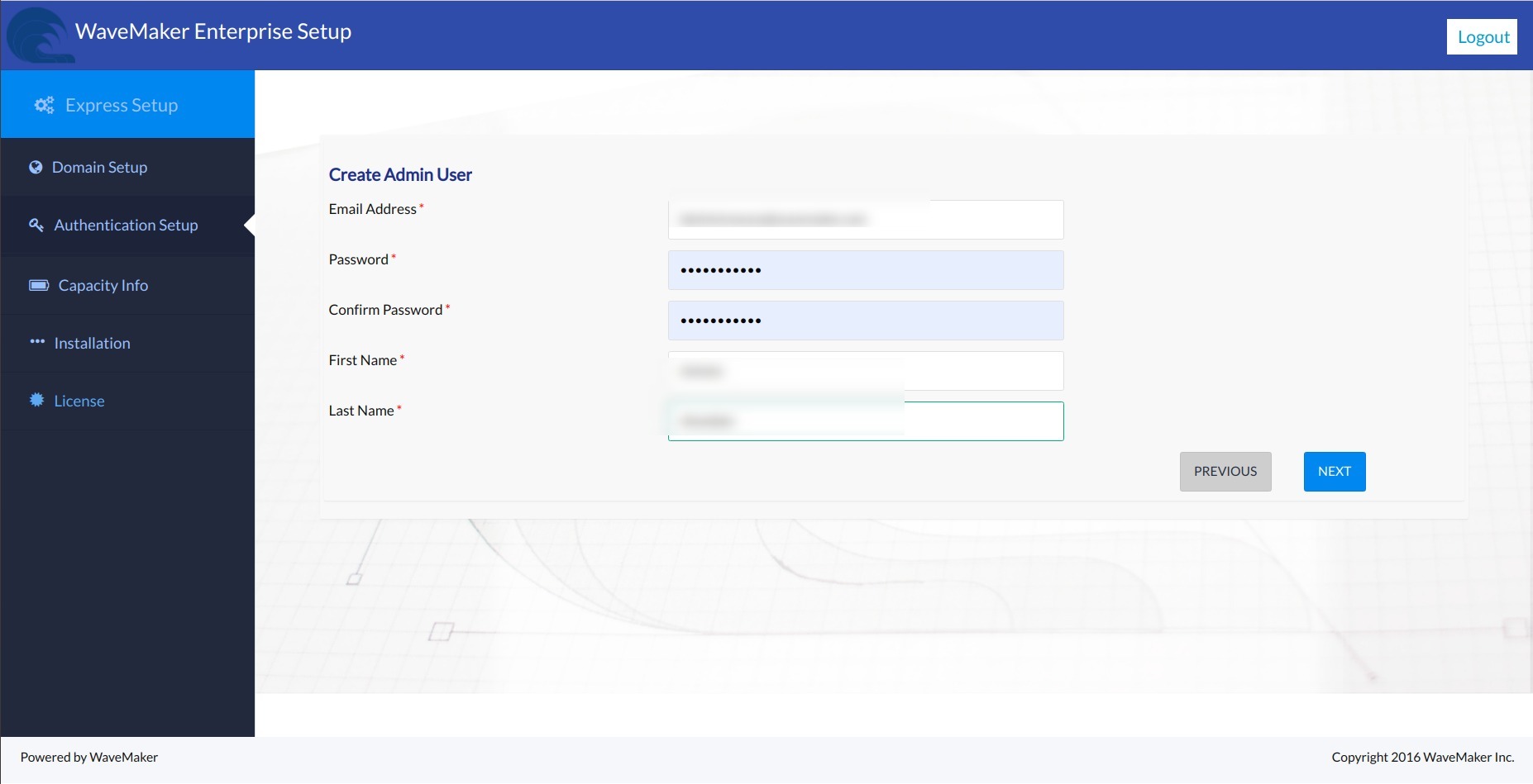 • Setup password for the WaveMaker setup portal. This password is system level. All command line operations are authenticated by this Password. Subsequent operations like upgrades needs this password.
