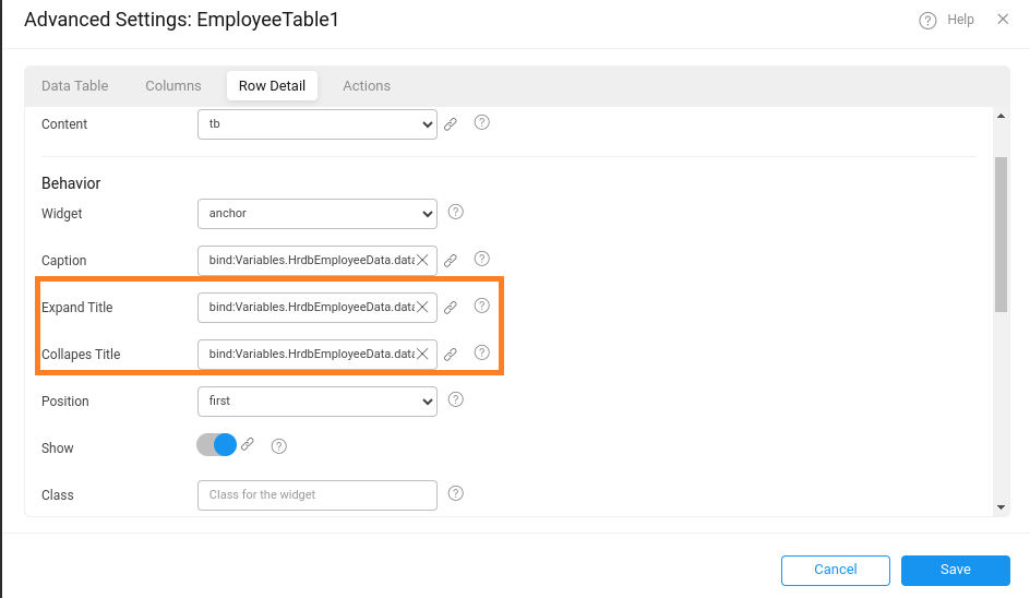 In previous versions, when Enable Row Expansion was activated in the Data Table widget, the Collapse Title and Expand Title properties in the Advanced Settings were not bindable; users could only input static text into these fields. With the latest update, these properties can now be dynamically bound to the dataset used in the Data Table, allowing titles to be fetched at runtime.